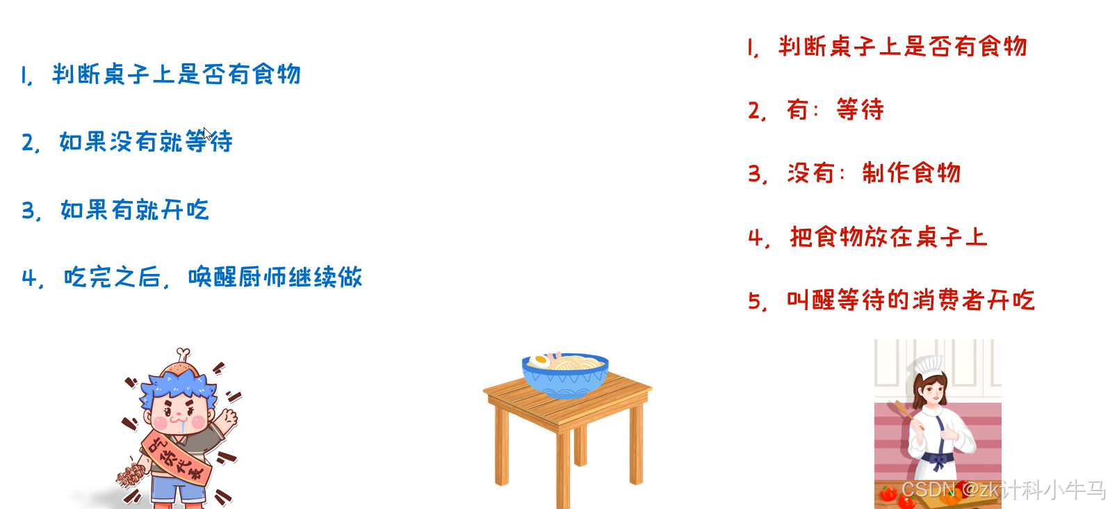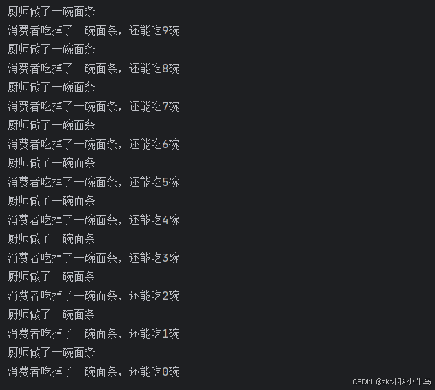 其实不然,消费者和生产者两条线程还是一条一次轮流执行的,重复输出是因为输出的代码放在了锁的外面,所以两个线程是随机的,抢着输出的,厨师做了多少碗面和消费者吃了多少碗的数量还是一样的。厨师放一碗面到队列,吃货就拿一碗。