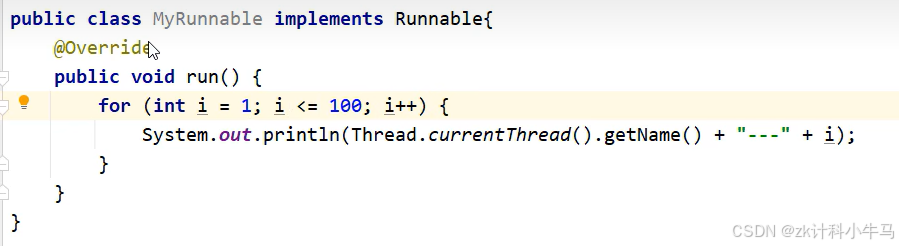 public class ThreadDemo2 { public static void main(String[] args) { MyThread myThread = new MyThread(); Thread thread1 = new Thread(myThread); Thread thread2 = new Thread(myThread); thread1.setName("线程1"); thread2.setName("线程2"); thread2.start(); thread1.start(); } } class MyThread implements Runnable{ @Override public void run() { for (int i = 0; i < 100; i++) { System.out.println(Thread.currentThread().getName()+"-->"+i); } } }