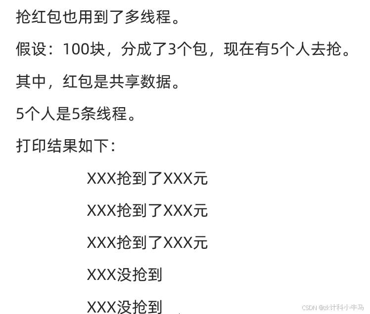 public class MyRunnable implements Runnable{ double money = 100; int count = 3; Random rnd = new Random(); public void run(){ synchronized (this) { if (count == 0){ System.out.println(Thread.currentThread().getName()+"没抢到"); }else if (count == 1){ count--; System.out.println(Thread.currentThread().getName()+"抢到了"+money+"元"); money = 0; } else { double get = (rnd.nextDouble()*money); System.out.println(Thread.currentThread().getName()+"抢到了"+get+"元"); money = money - get; count--; } } } } public class Test { public static void main(String[] args) { MyRunnable mr = new MyRunnable(); Thread t1 = new Thread(mr); Thread t2 = new Thread(mr); Thread t3 = new Thread(mr); Thread t4 = new Thread(mr); Thread t5 = new Thread(mr); t1.setName("玩家1"); t2.setName("玩家2"); t3.setName("玩家3"); t4.setName("玩家4"); t5.setName("玩家5"); t1.start(); t2.start(); t3.start(); t4.start(); t5.start(); } }