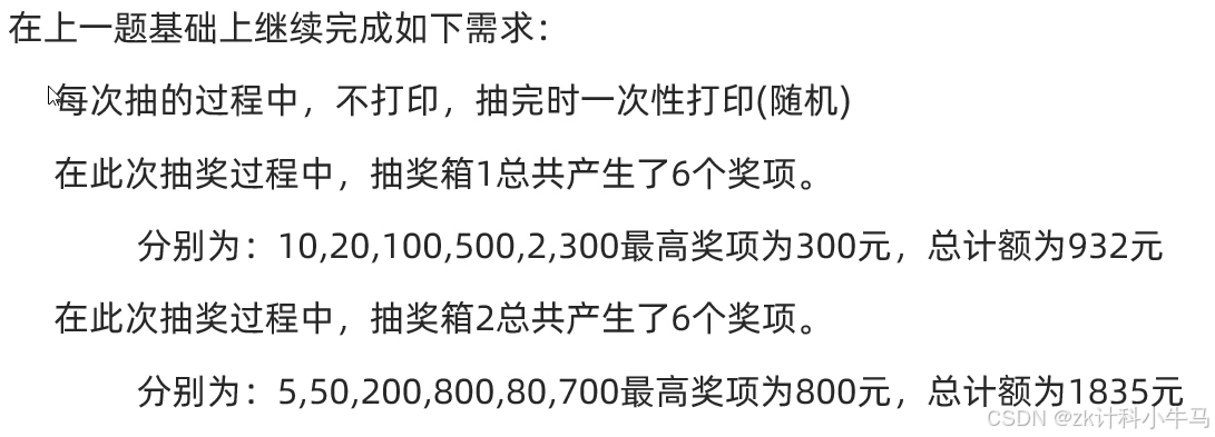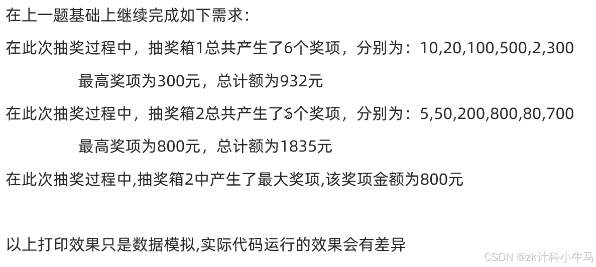 list; public MyRunnable(ArrayList list) { this.list = list; } @Override public void run() { //定义一个集合,收集每一个抽奖箱每次中奖的金额 ArrayList moneys = new ArrayList<>(); while (true){ synchronized (this) { if (list.isEmpty()){ Collections.sort(moneys); System.out.println("在此次抽奖过程中,"+Thread.currentThread().getName() +"总共产生了"+moneys.size()+"个奖项"); String string = moneys.toString(); System.out.println("\t分别为:"+string.substring(1,string.length()-1) +"最高奖项为"+moneys.get(moneys.size() - 1) +",总计额为"+moneys.stream().mapToInt(Integer::intValue).sum()); break; } Collections.shuffle(list); moneys.add(list.get(0)); list.remove(0); } try { Thread.sleep(10); } catch (InterruptedException e) { throw new RuntimeException(e); } } } } public class Test { public static void main(String[] args) { ArrayList list = new ArrayList<>(); Collections.addAll(list,10,5,20,50,100,200,500,800,2,80,300,700); String name1 = "抽奖箱1"; String name2 = "抽奖箱2"; MyRunnable mr = new MyRunnable(list); Thread t1 = new Thread(mr); Thread t2 = new Thread(mr); t1.setName(name1); t2.setName(name2); t1.start(); t2.start(); } }