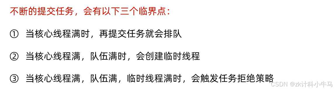 (3)但是如果提交任务时,池子中没有空闲线程,也无法创建新的线程,任务就会排队等待