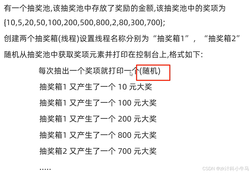 list; public MyRunnable(ArrayList list) { this.list = list; } @Override public void run() { while (true){ synchronized (this) { if (list.isEmpty()){ break; } Collections.shuffle(list); System.out.println(Thread.currentThread().getName()+"又产生了一个"+list.get(0)+"元大奖"); list.remove(0); } //在锁外面休眠一会,这样另外一个线程就先执行,输出会好看一点 try { Thread.sleep(1000); } catch (InterruptedException e) { throw new RuntimeException(e); } } } } public class Test { public static void main(String[] args) { ArrayList list = new ArrayList<>(); Collections.addAll(list,10,5,20,50,100,200,500,800,2,80,300,700); MyRunnable mr = new MyRunnable(list); Thread t1 = new Thread(mr); Thread t2 = new Thread(mr); t1.setName("抽奖箱1"); t2.setName("抽奖箱2"); t1.start(); t2.start(); } }