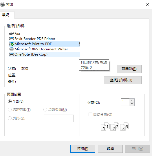 安装完成后,打开一个支持打印的文件类型或者网页,选择打印,在打印机界面可以看到Microsoft Print To PDF项