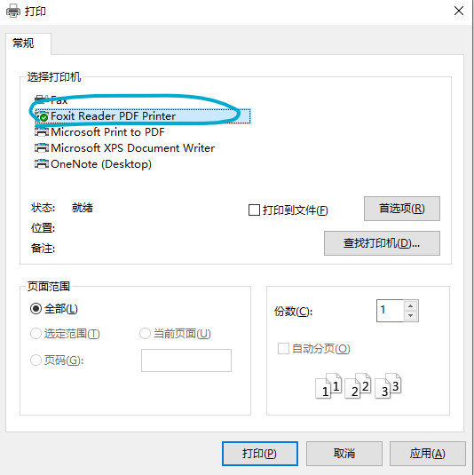 安装福昕阅读器后就会自动安装到打印机列表中,使用方式跟Microsoft Print To PDF一样