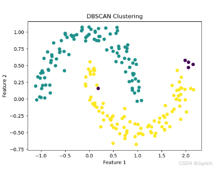 from sklearn.cluster import DBSCAN from sklearn.datasets import make_moons import matplotlib.pyplot as plt # 创建示例数据集 X, _ = make_moons(n_samples=200, noise=0.1) # 使用DBSCAN算法进行聚类 dbscan = DBSCAN(eps=0.2, min_samples=5) labels = dbscan.fit_predict(X) # 绘制聚类结果 plt.scatter(X[:, 0], X[:, 1], c=labels, cmap='viridis') plt.title('DBSCAN Clustering') plt.xlabel('Feature 1') plt.ylabel('Feature 2') plt.show()