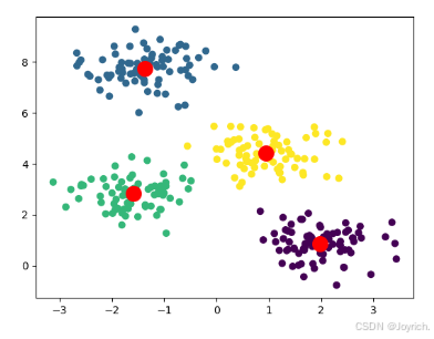 import numpy as np from sklearn.datasets import make_blobs from sklearn.cluster import KMeans import matplotlib.pyplot as plt # 创建一个示例数据集 X, _ = make_blobs(n_samples=300, centers=4, cluster_std=0.60, random_state=0) # 使用K均值算法进行聚类 kmeans = KMeans(n_clusters=4) kmeans.fit(X) # 获取簇中心和簇分配结果 centers = kmeans.cluster_centers_ labels = kmeans.labels_ # 绘制聚类结果 plt.scatter(X[:, 0], X[:, 1], c=labels, cmap='viridis') plt.scatter(centers[:, 0], centers[:, 1], marker='o', s=200, color='red') plt.show()