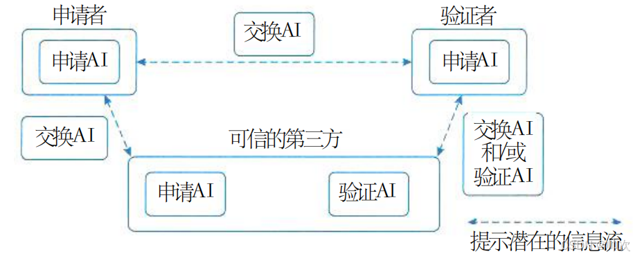 注:在某些特定的情况下,可以不涉及可信任的第三方。验证A I可以是主体的,也可以是可信任第三方的。