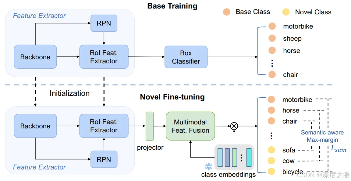 提出了一种基于fine-tuning的框架,利用语义嵌入来提高对新类别的泛化能力。该框架在新的fine-tuning阶段使用语义相似度分类器(SSC)代替线性分类器,并通过计算类别名称嵌入和提议区域特征之间的余弦相似度来产生分类结果。