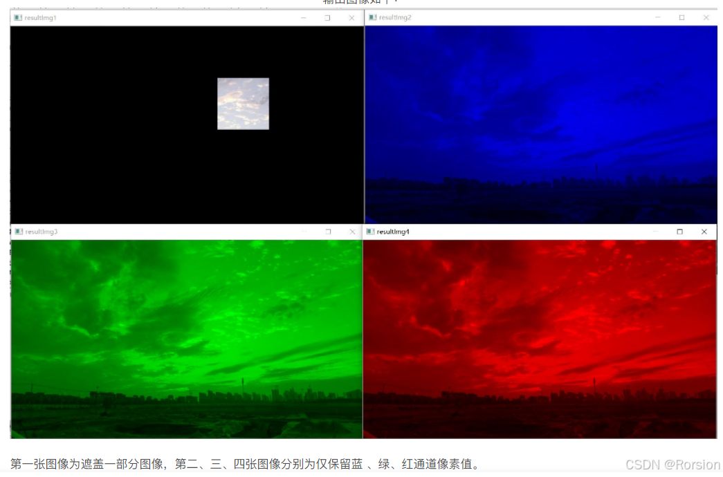 import numpy as np import cv2 # 读取图像 img = cv2.imread('1.jpg') img = cv2.resize(img, dsize=None, fx=0.3, fy=0.3) # 下面2行代码构造输出OpenCV图标的掩膜,255确保所有位都是1 imgMask = np.zeros(img.shape, dtype=np.uint8) imgMask[100:200, 400:500] = 255 # 执行按位与操作 resultImg1 = cv2.bitwise_and(img, imgMask) resultImg2 = cv2.bitwise_and(img, (255, 0, 0)) resultImg3 = cv2.bitwise_and(img, (0, 255, 0)) resultImg4 = cv2.bitwise_and(img, (0, 0, 255)) # 显示结果图像 cv2.imshow('resultImg1', resultImg1) cv2.imshow('resultImg2', resultImg2) cv2.imshow('resultImg3', resultImg3) cv2.imshow('resultImg4', resultImg4) cv2.waitKey(0)