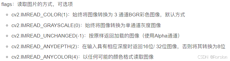 cv2.imread:这个函数可以直接用cv2.imread('filename', cv2.IMREAD_GRAYSCALE)直接将图片以黑白图像输入,也可以通过cv2.imread(img, 0)来将图片以黑白图像输入。其实这两者是一样的,如下图所示,可以将特定的颜色通道用数字表示。如果直接用cv2.imread('filename')表示默认读入彩色图像.注意cv2.imread() 如果无法从指定文件读取图像,并不会报错,而是数返回一个空矩阵。