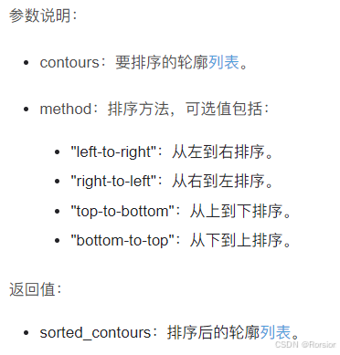 def sort_contours(cnts, method): reverse = False i = 0 if method == "right-to-left" or method == "bottom-to-top": reverse = True if method == "top-to-bottom" or method == "bottom-to-top": i = 1 #返回的boundingBoxes是一个元组,其中包含4个值,分别为x,y,w,h boundingBoxes = [cv2.boundingRect(c) for c in cnts] (cnts, boundingBoxes) = zip(*sorted(zip(cnts, boundingBoxes), key = lambda b: b[1][i], reverse = reverse)) return cnts, boundingBoxes