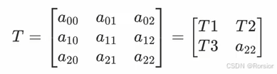 其中,(u,v)是原始图像像素坐标,w取值为1,(x=x'/z',y=y'/z')是透射变换后的结果。后面的矩阵称为透视变换矩阵,一般情况下我们将其分为三部分,如下图