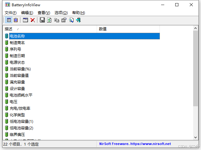 BatteryInfoView是一款免费的笔记本电池检测软件,适用于笔记本电脑和上网本。该软件能够提供电池的详细信息,包括电池名称、制造商名称、序列号、制造日期、电源状态(充电/放电)、当前电池容量、完全充电容量、设计容量、充电放电比率以及电池温度等。