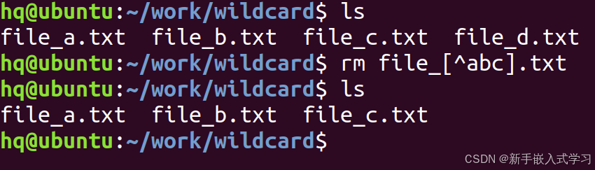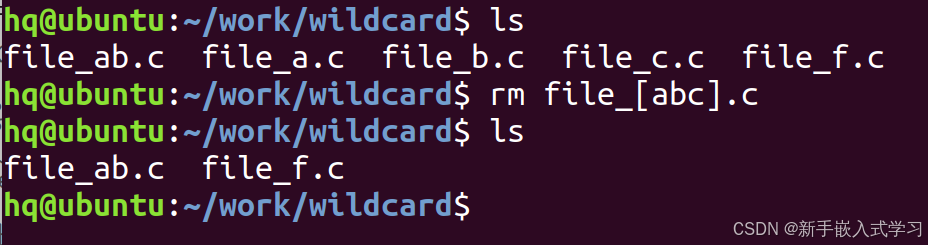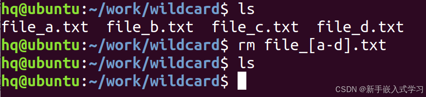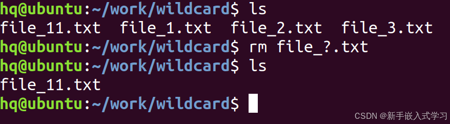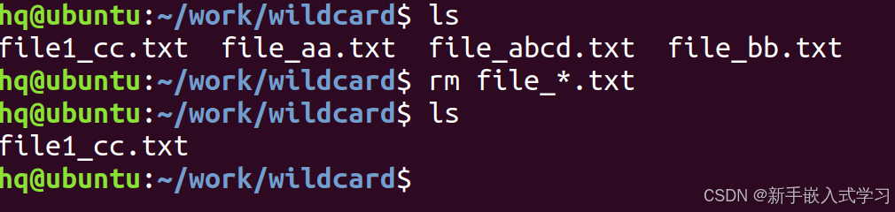 ● 用 file_*.txt,匹配到file_aa.txt、file_bb.txt、file_abcd.txt 能匹配到的,file1_cc.txt则匹配不到(命令后面单独使用 * 表示全部,如:rm *:表示删除全部文件)
