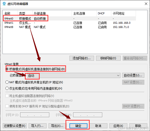 (1) 编辑->虚拟网络编辑器->更改设置->选择vmnet0->桥接模式->桥接的网络适配器(根据主机的网络连接进行选择,当然选择自动也可以)->确定,如果自动不行也可以找到对应的网络适配器。