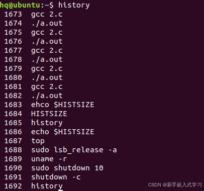 history: 查看历史命令,默认显示的命令行数根据HISTSIZE来决定echo $HISTSIZE: 将变量的值打印到终端,echo命令作用是打印内容到终端
