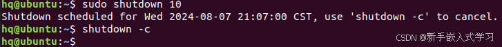 sudo shutdown -h 时间 "提示语句": 定义关机
