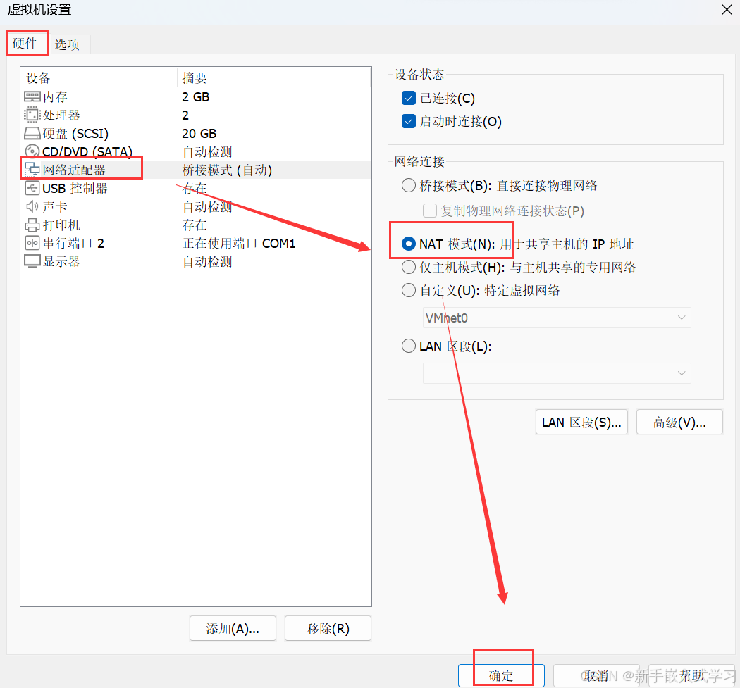 (2)虚拟机->设置->网络适配器->选择nat模式