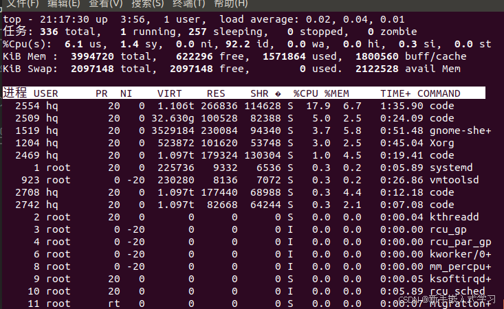 动态查看系统中运行的进程shift >: 向下翻页 shift <: 向上翻页 q: 退出