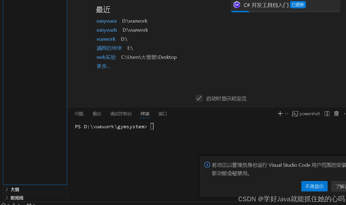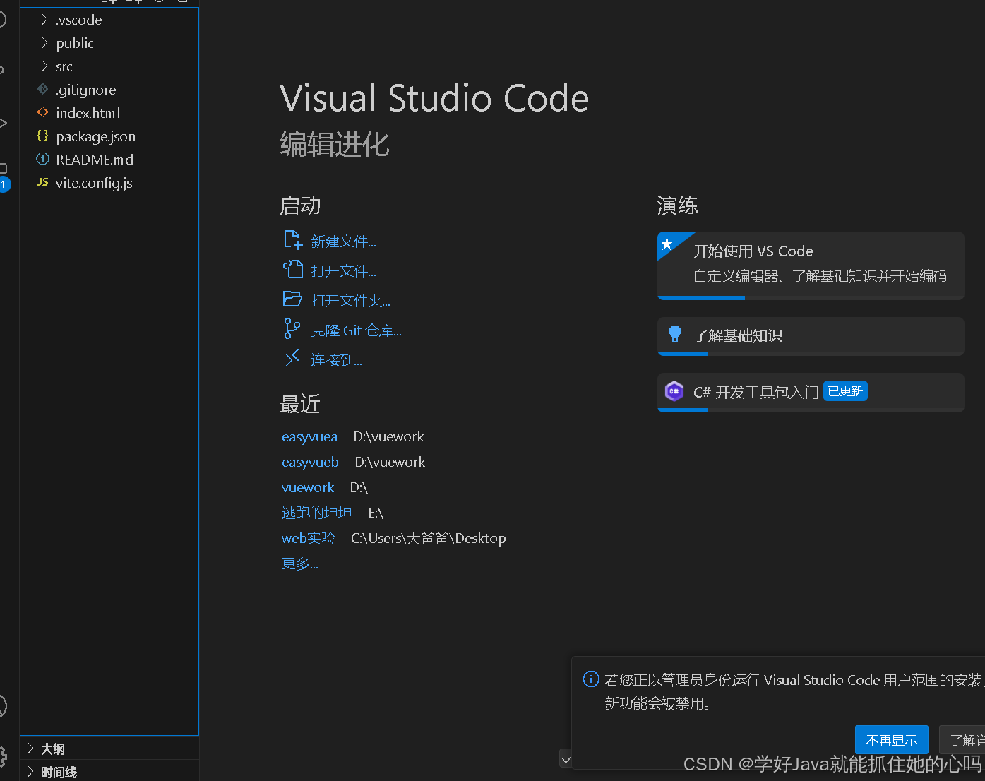 2.VisualStudioCode打开(可能需要管理员权限)创建的文件夹,点击左侧选中