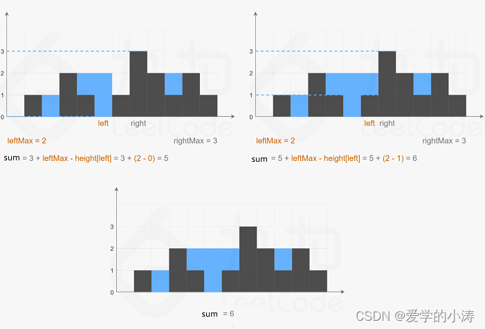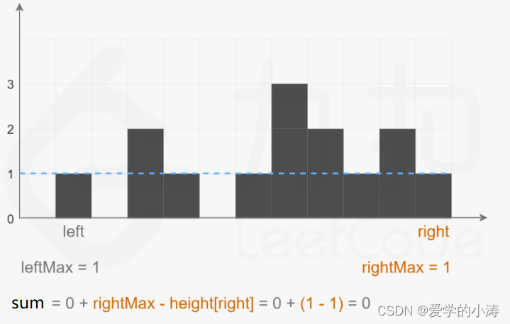 (2)如果 height[left] < height[right],则必有 leftMax < rightMax,下标 left 处能接的雨水量等于 leftMax − height[left],将下标 left 处能接的雨水量加到能接的雨水总量,然后将 left 加 1(即向右移动一位)即执行:sum += leftmax - height[left]; left++;