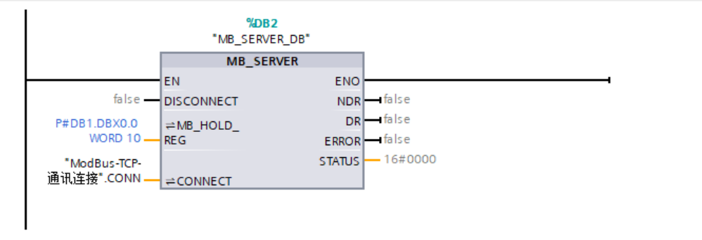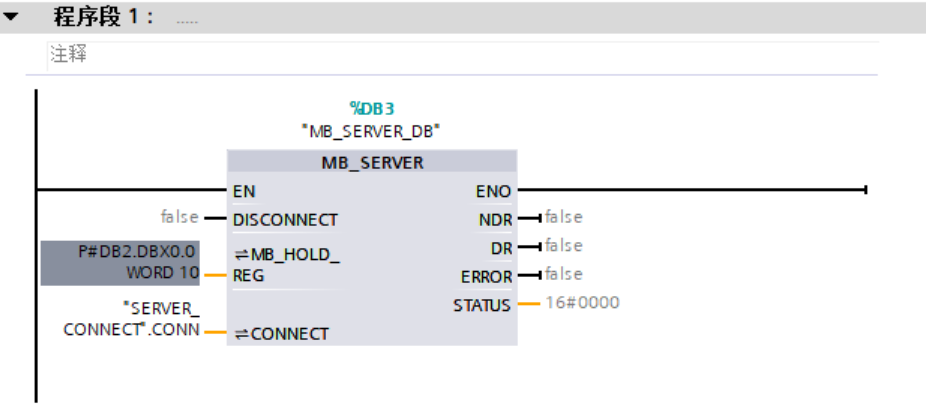 ②在ob1中添加功能块如下:创建DB块存储连接信息,数据格式为TCON_IP_v4,程序如下:
