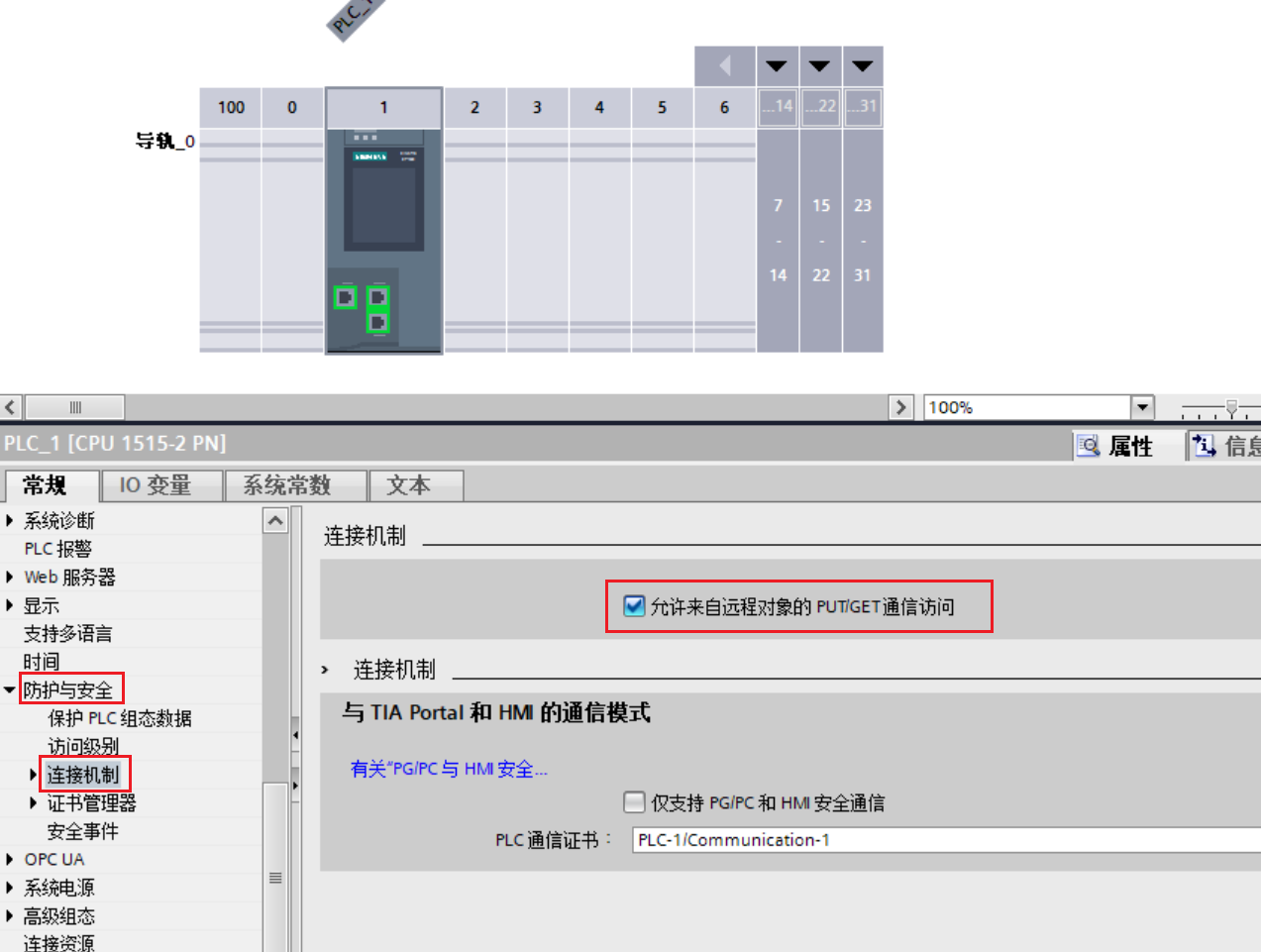 ②设备视图中配置CPU如下(允许PUT/GET通信访问)