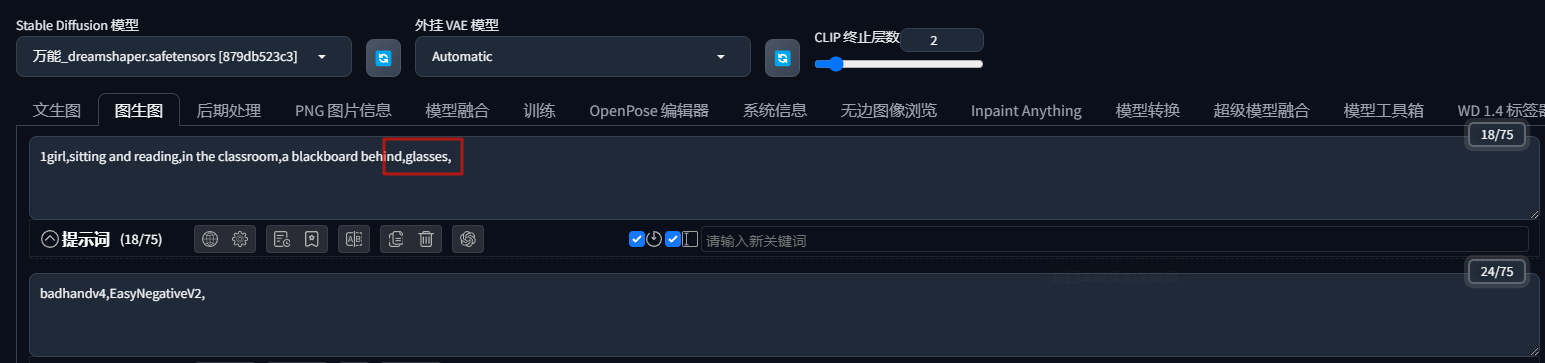 在图片中,用画笔画一个眼镜形状,正向提示词中添加glasses,降低重绘幅度=0.5。