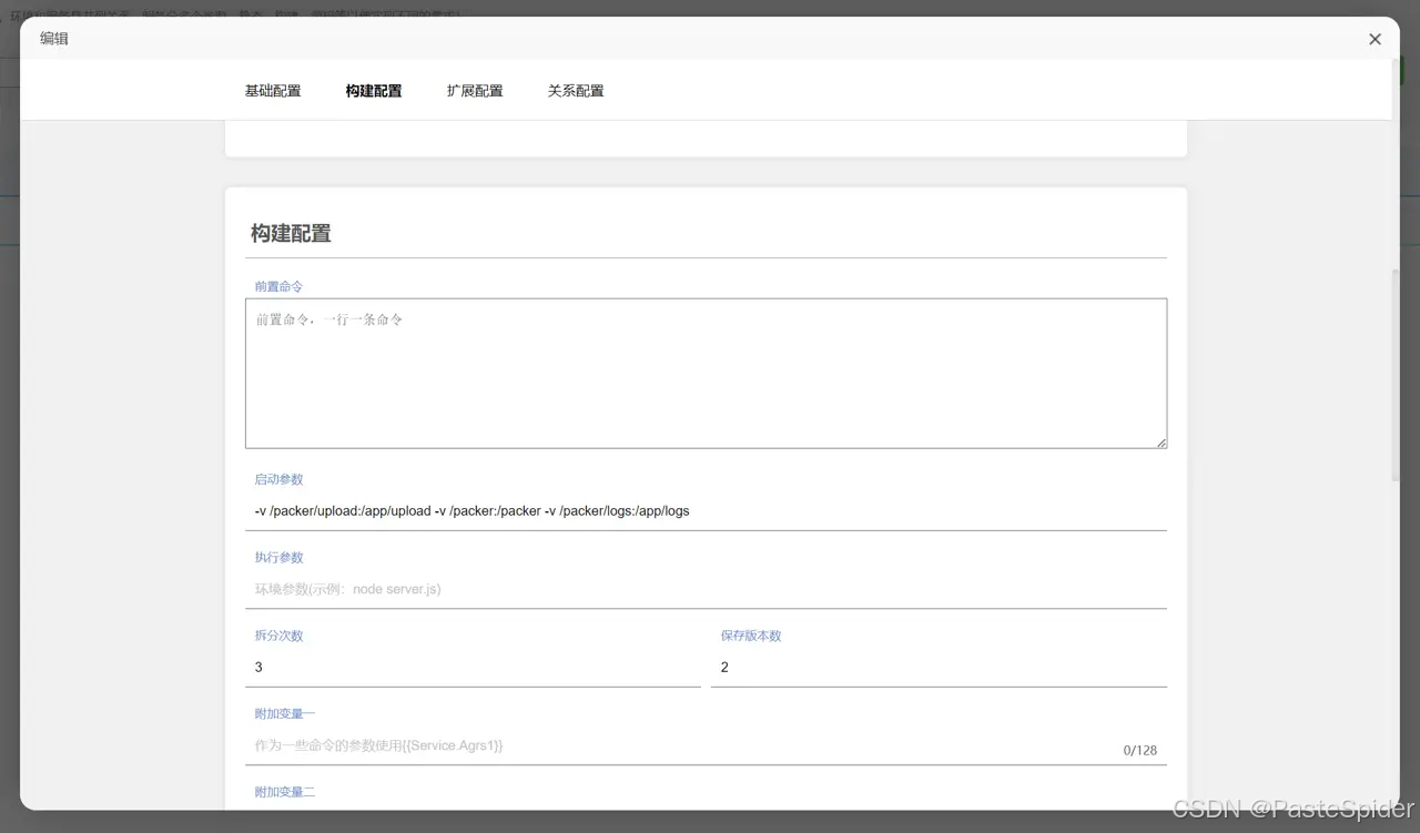 镜像保存版本,只有需要构建镜像的需要用到这个配置,几乎每次升级都需要生成新的镜像,镜像多了也是会占用服务器的硬盘资源的,所以PasteSpider配置了服务的镜像存储版本数,超过的会删除。