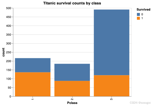 class_survival_counts = ( df .groupby('Survived','Pclass') .count())alt.Chart( class_survival_counts, width=600).mark_bar().encode( x="Pclass:N", y="count:Q", color="Survived:N")