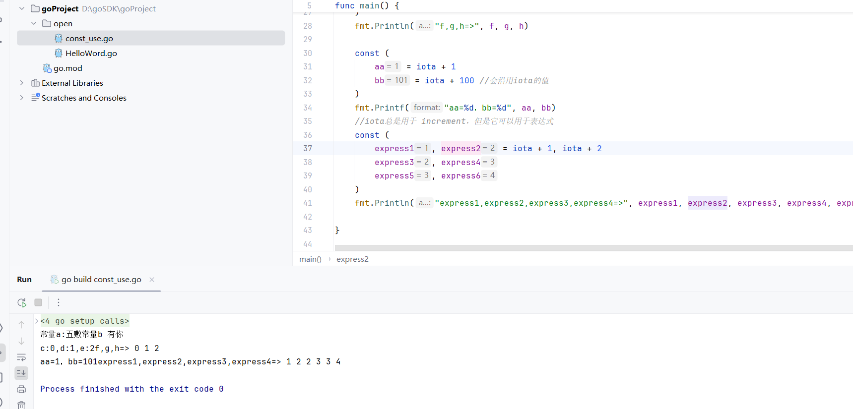 const ( aa = iota + 1 bb = iota + 100 //会沿用iota的值 ) fmt.Printf("aa=%d,bb=%d", aa, bb) //iota总是用于 increment,但是它可以用于表达式 const ( express1, express2 = iota + 1, iota + 2 express3, express4 express5, express6 ) fmt.Println("express1,express2,express3,express4=>", express1, express2, express3, express4, express5, express6)