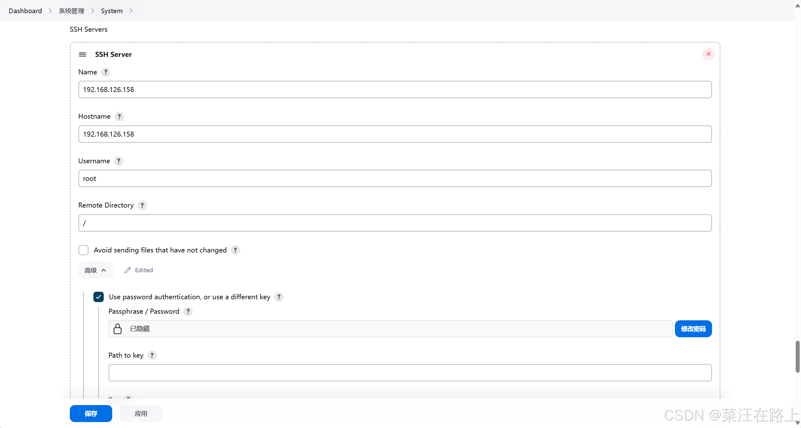 配置ssh也就是项目需要运行的服务器,远程将打包好的jar包上传上去,然后远程执行运行docker。这里配置地址和连接信息,具体的操作需要在jenkins构建项目时详细配置。