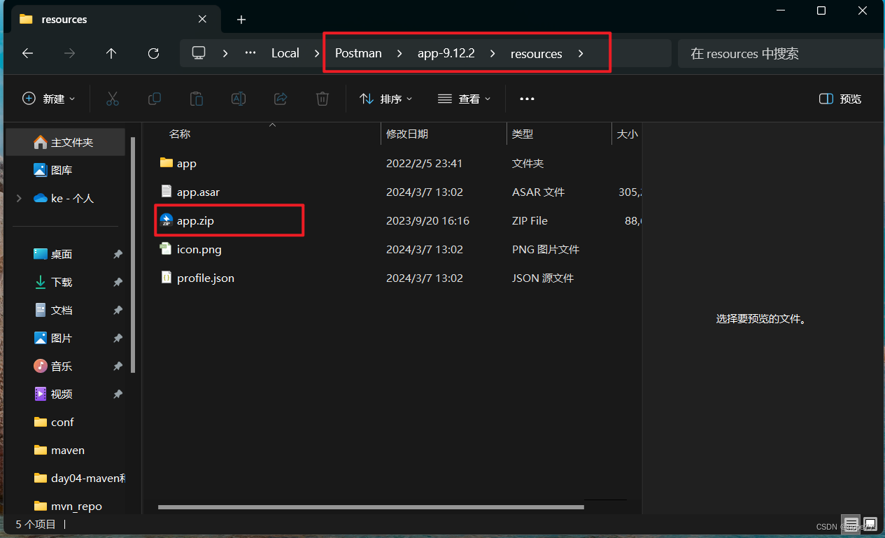 4. 将 app.zip 文件, 放在 Postman\app-9.12.2\resources 文件下, 解压 app.zip 文件