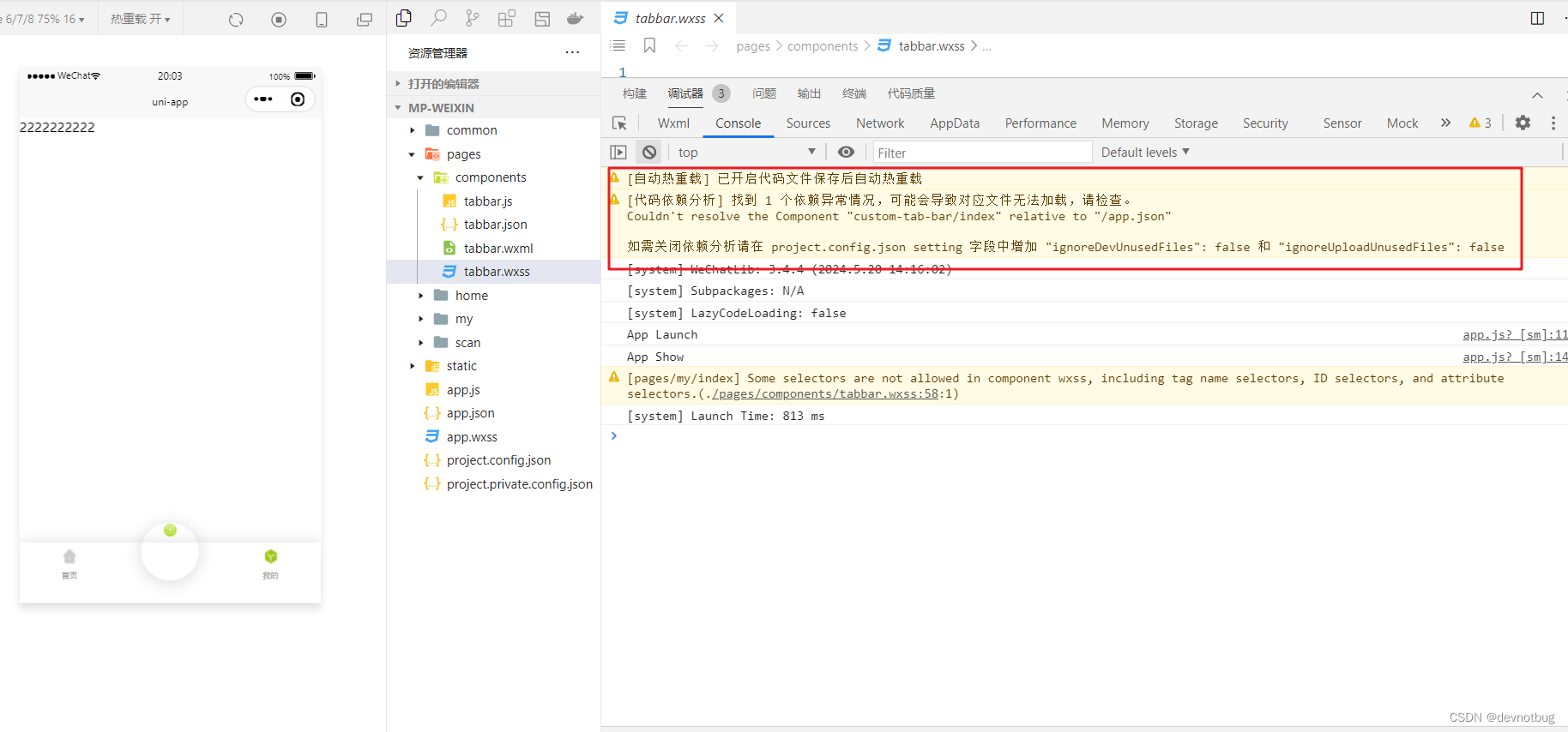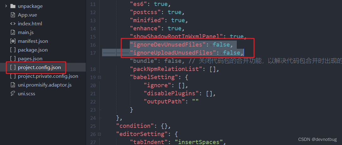 6、运行起来后可能会报一个错误 这时候我们需要在 project.config.json 文件中的 setting 中添加两个字段的配置