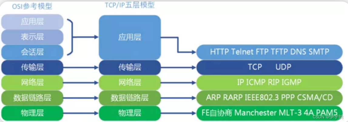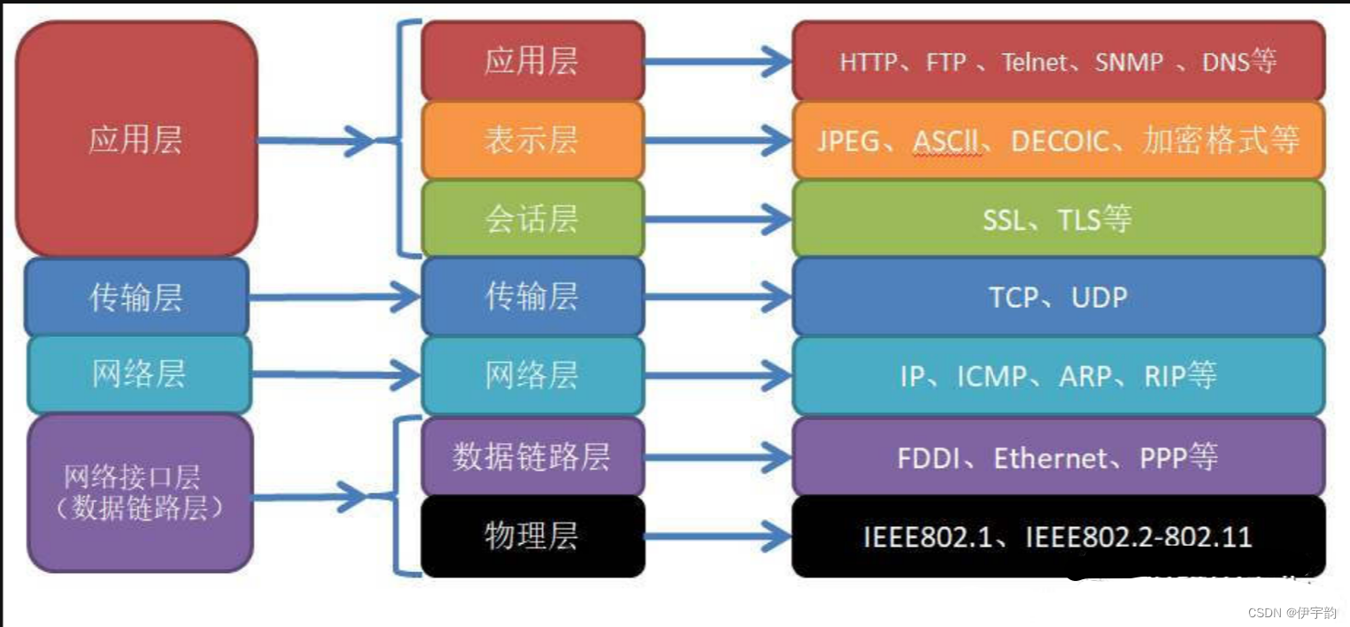 在每⼀层实现的协议也各不同,即每⼀层的服务也不同,下图列出了每层主要的传输协议: