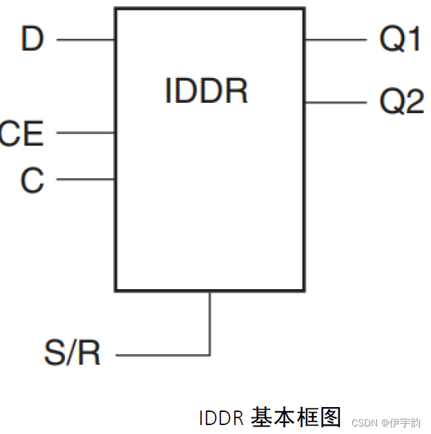 同样,设计实现时,可通过使用xilinx 的IDDR 原语,将该接口使用ILOGIC 块实现。在ILOGIC 块中,有着专用的寄存器,用于实现输入双倍数据速率(DDR)寄存器,当我们实例化IDDR 原语时便会自动访问该功能。IDDR 原语的框图如图所示: