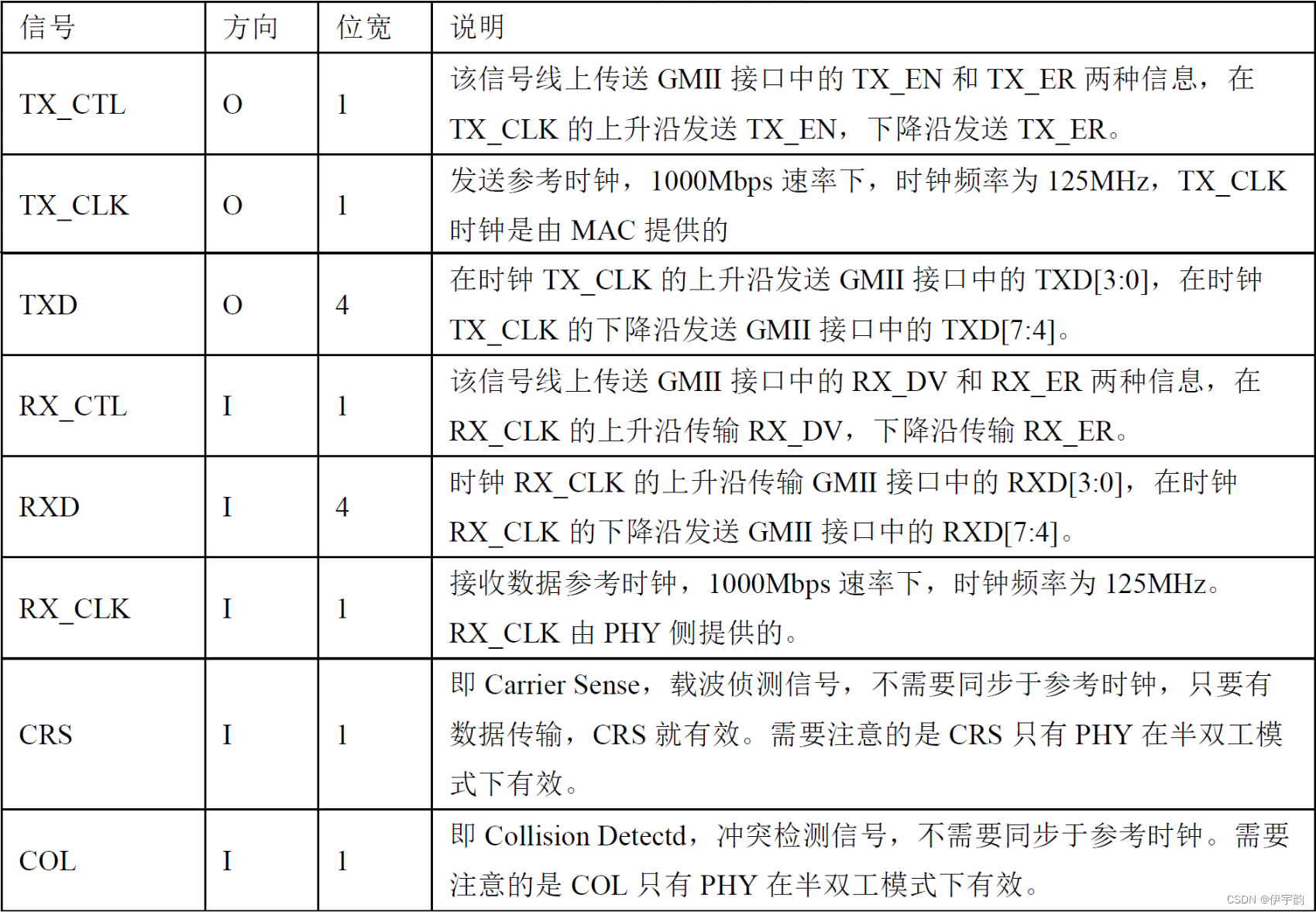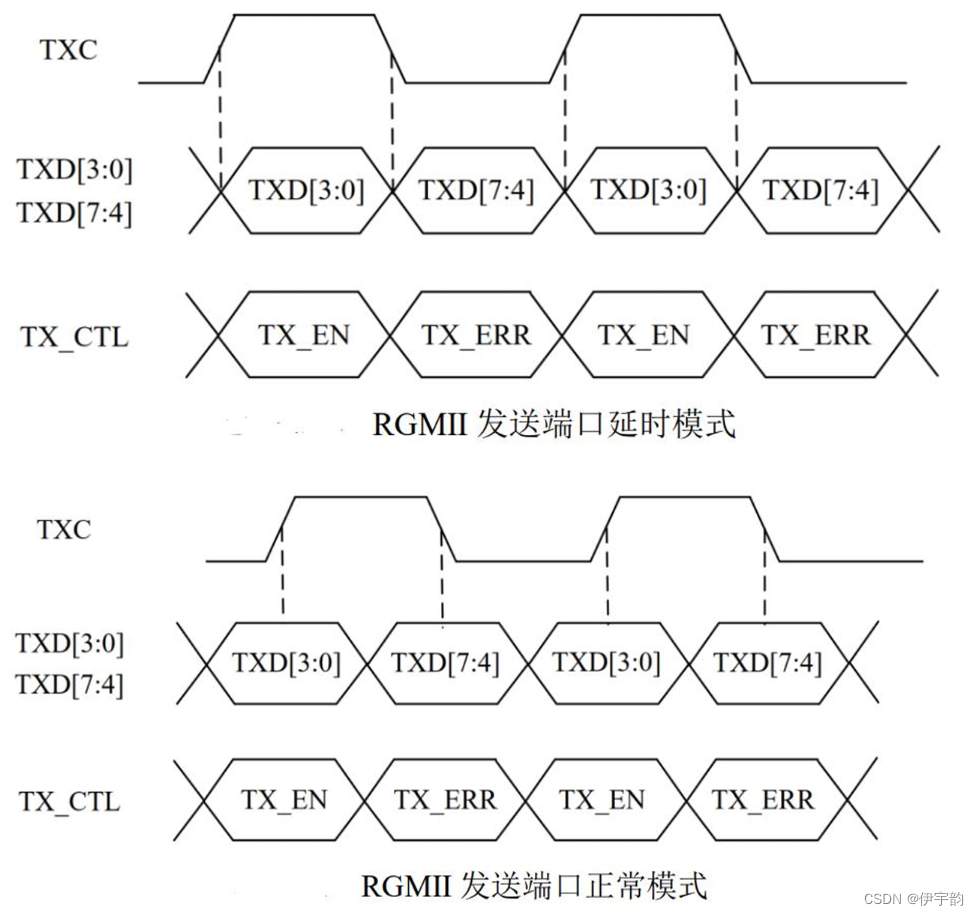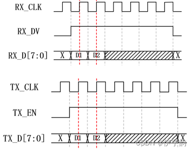 RGMII接口为了保持1000Mbps 的传输速率不变, RGMII 接口在时钟的上升沿和下降沿都采样数据。在参考时钟的上升沿发送 GMII 接口中的 TXD[3:0]/RXD[3:0] ,在参考时钟的下降沿发送 GMII 接口中的 TXD[7:4]/RXD[7:4] 。