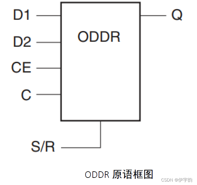 设计实现时,我们需要使用xilinx 的ODDR(Output Double Data Rate,输出双倍数据速率)原语,将该接口使用OLOGIC 块实现。ODDR 原语只有一个时钟输入,下降沿数据由输入时钟的本地反转来计时,反馈到I/O块的所有的时钟被完全复用,ODDR 原语的框图如图 所示: