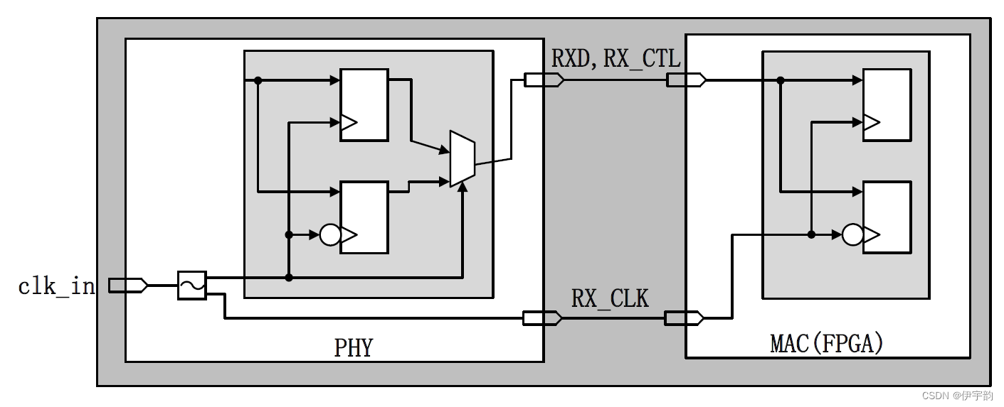 对于 FPGA 来说,实现 RGMII 接口的接收同样是一个非常直接的过程, 整个接收逻辑框图如图所示: