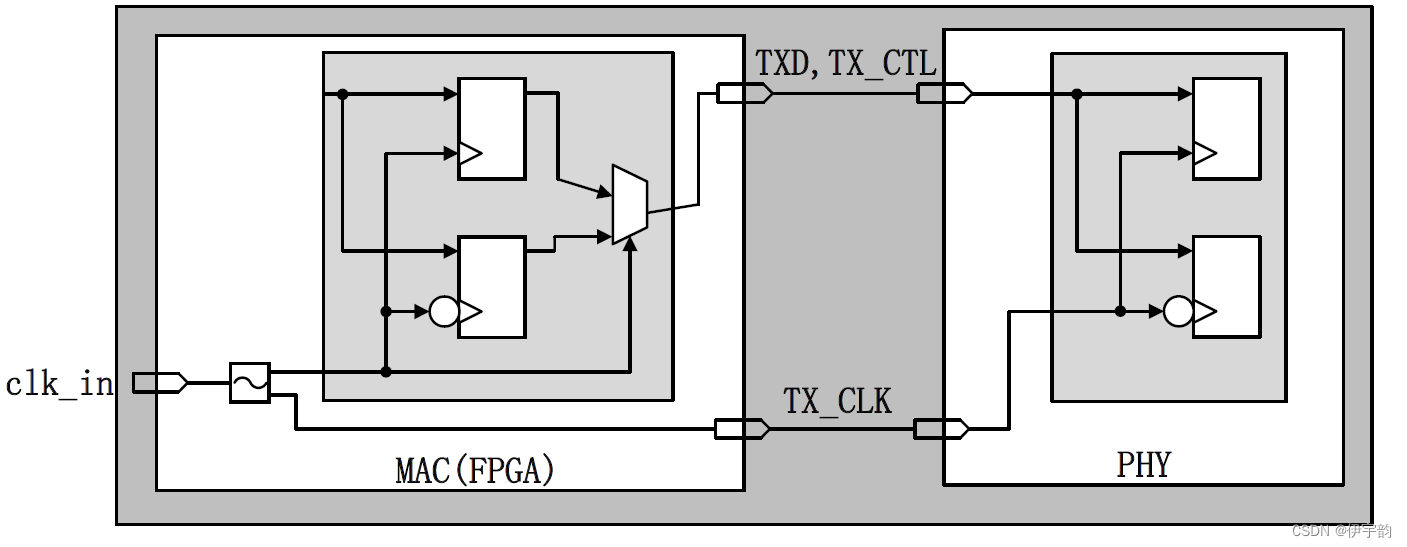 对于FPGA来说,实现 RGMII 接口的发送是一个非常直接的过程,整个发送逻辑框图如图所示:
