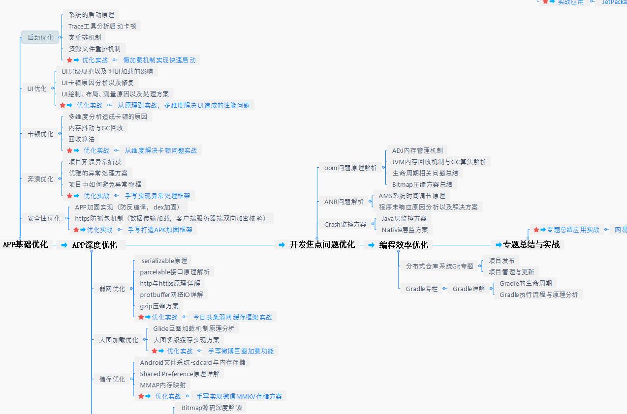 性能优化不是一件简单的事情,每个应用的性能好与坏无法由一个人来决定,因为性能优化的维度有太多了,从我们项目的整体架构,到我们代码的每一个细节,再到应用使用环境的测试,只有步步为营,才能做好一个项目的优化。大部分开发者把性能优化指向与不闪退就行,但是实际上性能优化包含了很多方面,比如从简单的启动优化、 UI优化、 卡顿优化、 崩溃优化、 安全性优化,到深层次的弱网优化、 大图加载优化、 储存优化、 高效传输优化、 极限瘦身优化,再到实际开发过程中的OOM问题原理解析、 ANR问题解析、 Crash监控方案。要想把这些优化流程做好,我们不仅从项目架构、代码规范等方面入手,还用学会利用第三方的检测工具来检测项目性能,最主要是,我们需要一套完整的性能优化方案,这正是我们所缺少的,所以我们必须要把缺少的补上, 打造一套真正的完整的性能优化体系,把性能优化流程化,常态化。