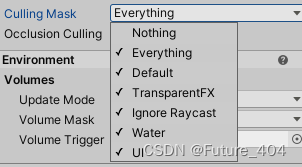 Occlusion Culling(遮挡剔除):防止 Unity 为那些被其他游戏对象完全挡住(遮挡)的游戏对象执行渲染计算,可选下面这些