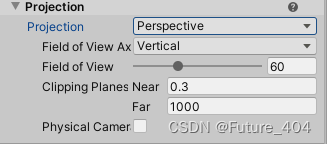 Perspective(透视投影):远小近大的效果,可以通过调节Field of View来调节视野大小