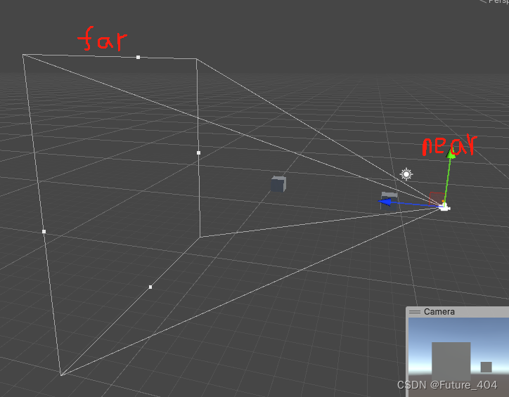 Near Clipping Planes(近裁剪空间) :相机视锥体靠近相机一侧的平面,在这个平面之前,物体就会被裁剪,不会被渲染,