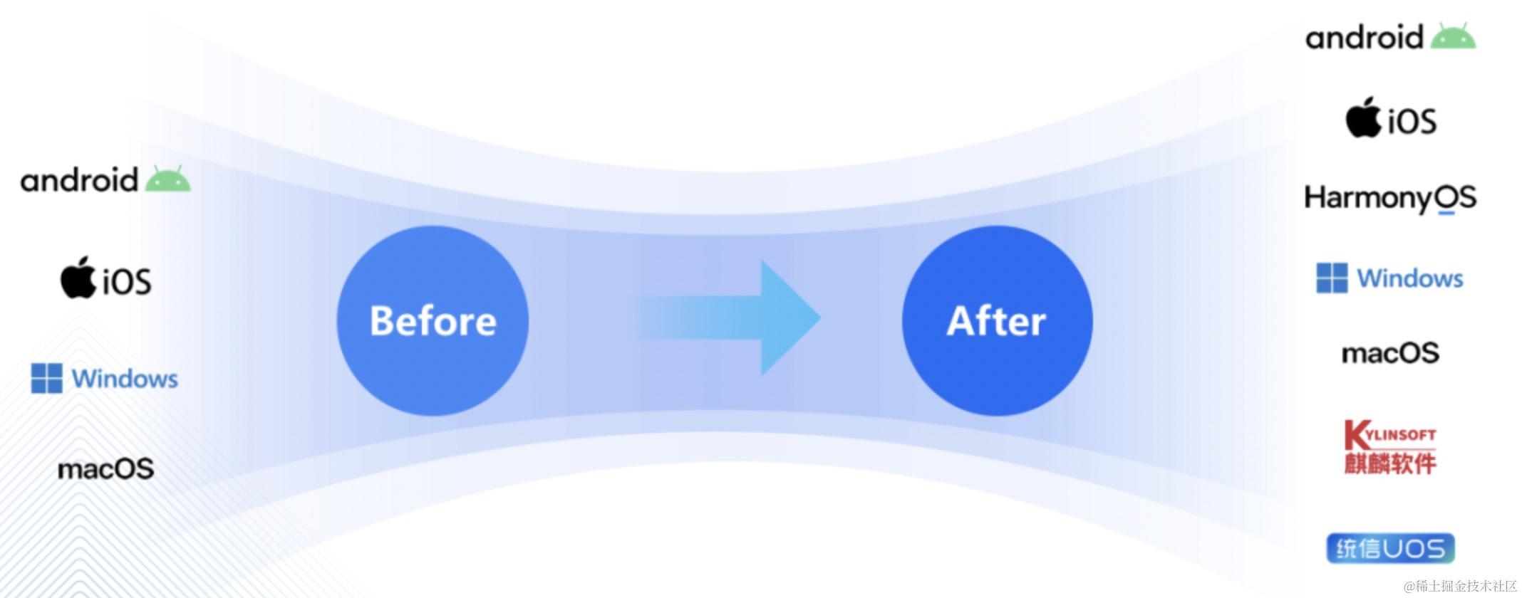 终端系统的数量和种类不断增长,开发者面临着多平台开发的挑战。以往开发者一般只需要维护iOS、android、MacOS、windows几个主流核心终端操作系统即可,但是随着信创化的趋势,统信、麒麟、鸿蒙等操作系统也开始崛起,后续可能还会涌现 HyperOS、BlueOS 等等操作系统,如果这么多的操作系统终端,每个终端都用不同的语言维护,研发成本将是巨大的。