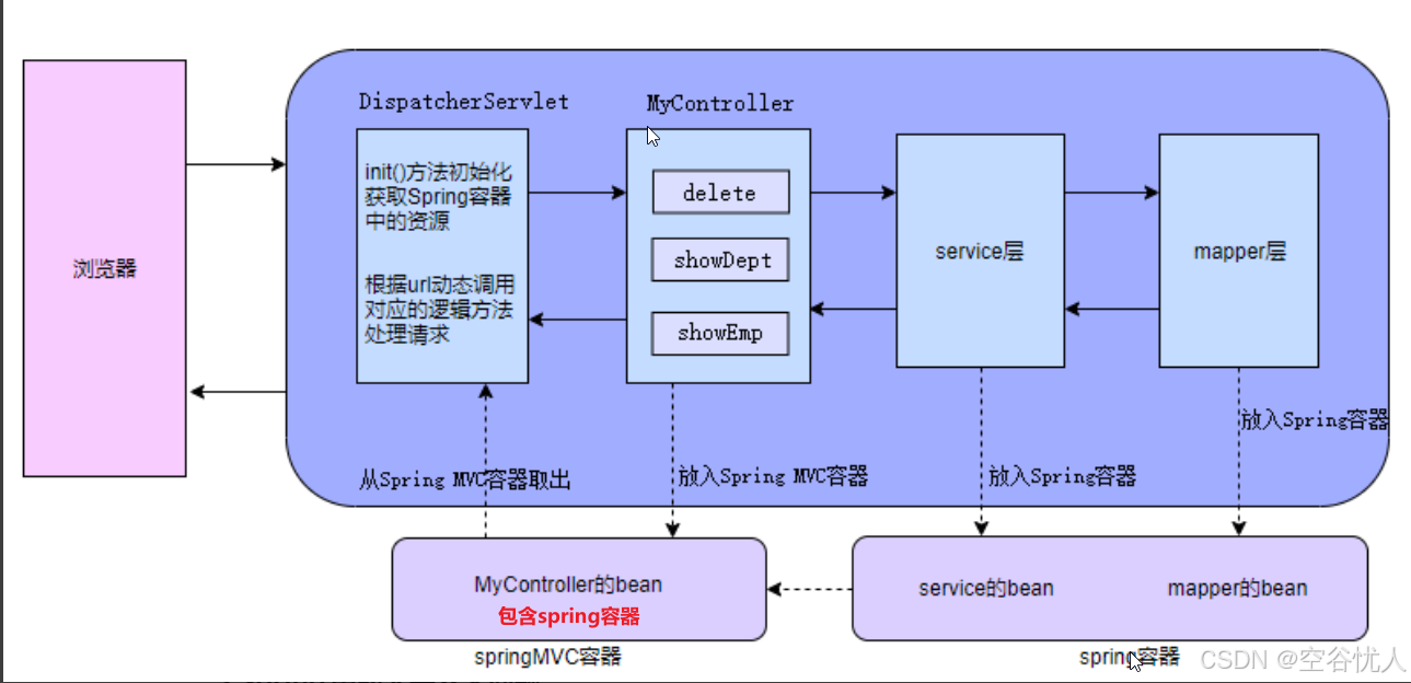 - 当请求到达服务器时,容器(如 Tomcat)将请求传递给 前端控制器 ( DispatcherServlet ),