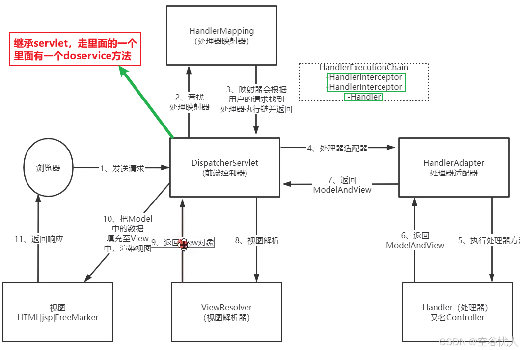 是 Spring 应用上下文的一个子接口,它包含所有 Bean 的定义和配置信息。- 前端控制器 ( DispatcherServlet ) 收到请求调用处理器映射器 (HandlerMapping),通过 URL 或其他规则来决定应该调用哪个控制器。而处理器映射器(HandlerMapping)找到具体的处理器(可以根据 xml 配置、注解进行查找),生成处理器对象及处理器拦截器(如果有则生成)一并返回给 DispatcherServlet。