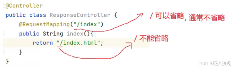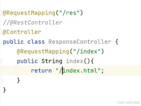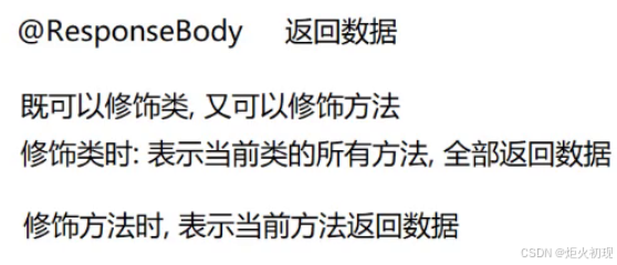 - Controller:这个注解的返回值通常会经过视图解析器解析,然后返回给用户一个渲染后的HTML页面。如果需要在Controller中返回JSON或XML数据,需要在方法上额外添加@ResponseBody注解。