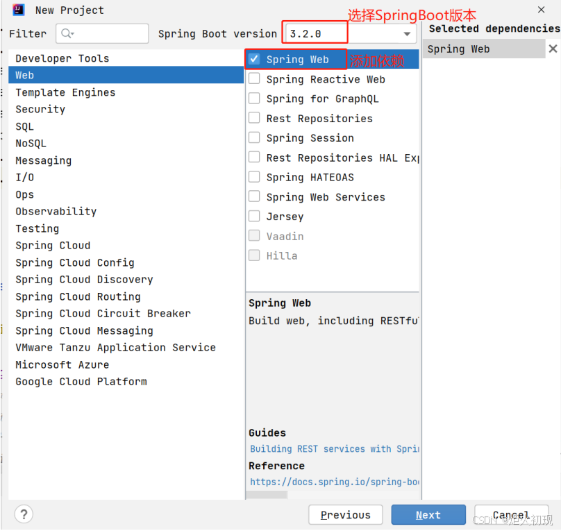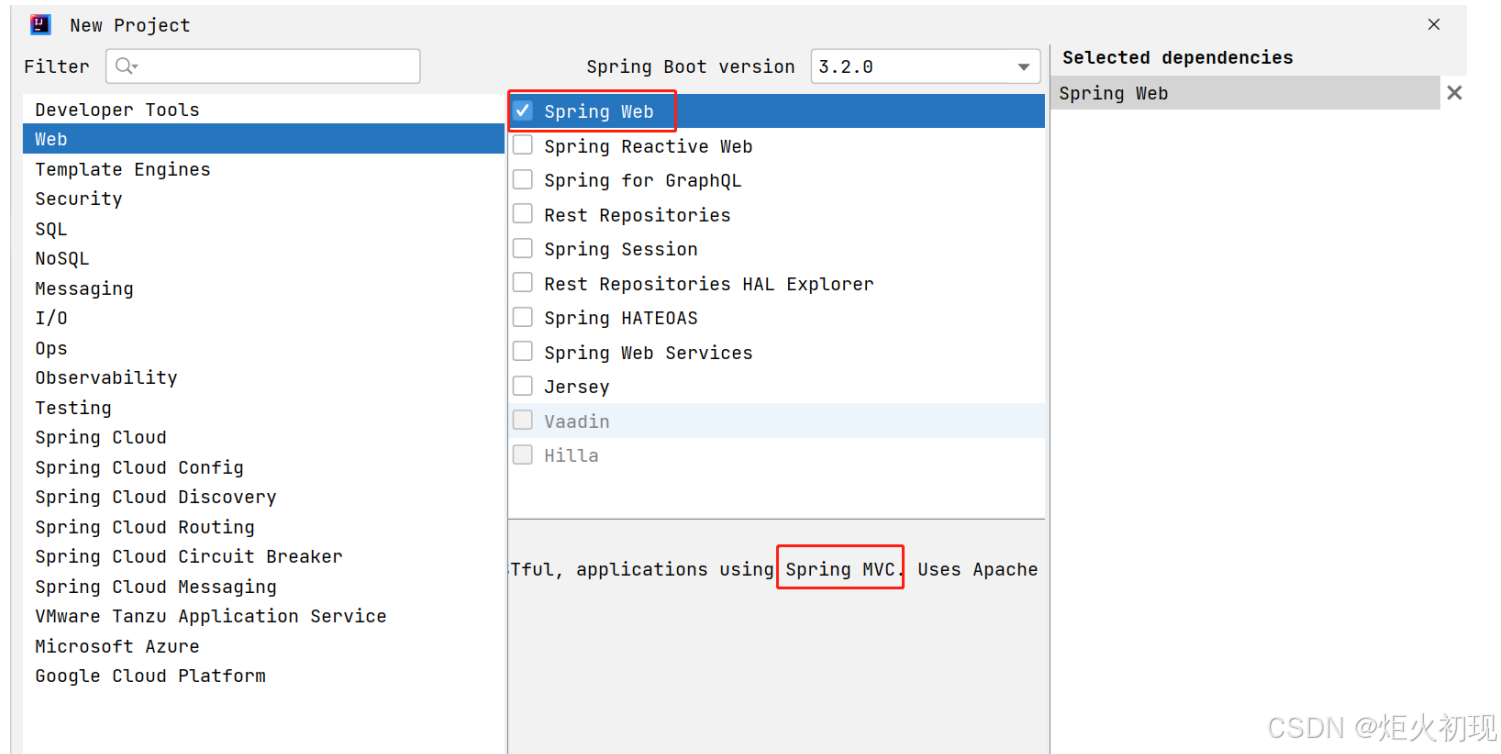 MVC 是⼀种架构设计模式, 也⼀种思想, ⽽ Spring MVC 是对 MVC 思想的具体实现. 除此之外, Spring MVC还是⼀个Web框架. 总结来说,Spring MVC 是⼀个实现了 MVC 模式的 Web 框架. 所以, Spring MVC主要关注有两个点: 1. MVC 2. Web框架 Spring MVC 全称是 Spring Web MVC其实, Spring MVC 我们在前⾯已经⽤过了, 在创建 Spring Boot 项⽬时,我们勾选的 Spring Web 框架 其实就是 Spring MVC 框架: