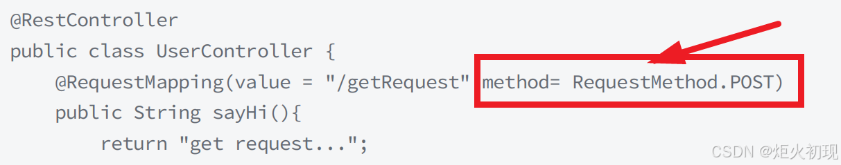 既⽀持Get请求, ⼜⽀持Post请求. 同理, 也⽀持其他的请 求⽅式.那如何指定GET或者POST类型呢? 指定GET/POST⽅法类型 我们可以显⽰的指定@RequestMapping 来接收
